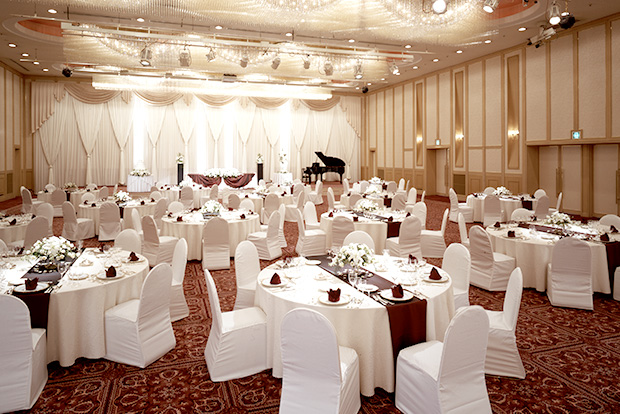 天井高6.6メートルの広々とした空間と、 照明・音響などの最高の設備を備えた明治記念館のメインバンケットです。 広い空間を使った自由度の高い演出が可能な会場です。