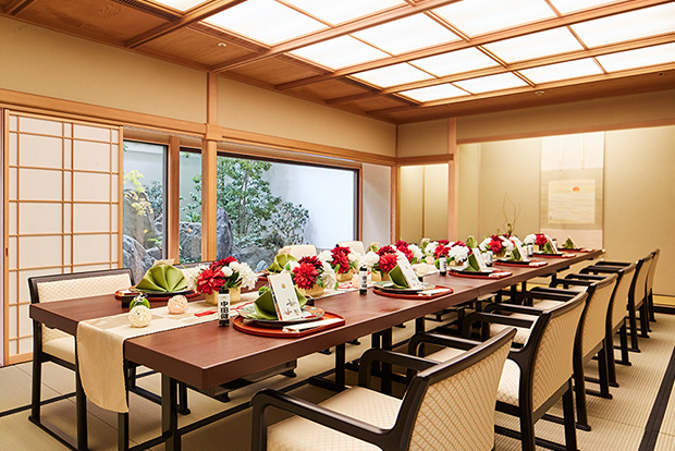 懐石料亭「花がすみ」内にある「かいどうの間」は、 外光がたっぷりと差し込む明るいお部屋で、晴れの日を鮮やかに演出致します。 開放感ある一枚の大窓が印象的で、坪庭を彩る四季の移ろいも満喫頂けます。 ゆったりと配置された幅広の専用チェアは、格別なくつろぎを運びます。