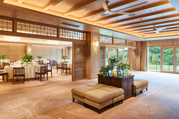 当館に於いて、唯一プライベートホワイエが設けられた会場です。 様々なアレンジができ、お客様のオリジナルウエディングスタイルを演出する事が出来ます。 温かみのある木や和紙で統一された空間は、装花やテーブルコーディネートにより、 表情や印象が多岐に変化する庭園に面したテラス付きの会場です。