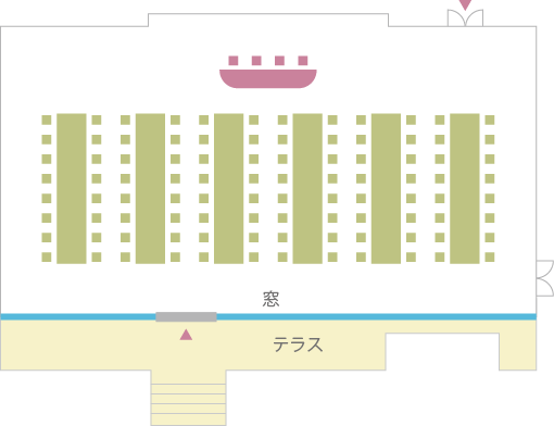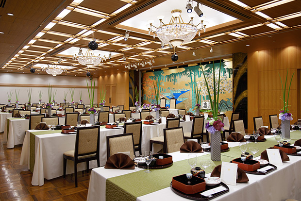 庭園に面した若竹の間は、和装はもちろん、 おふたりがドレスやタキシードを纏ったときの調和にも気配りされた空間です。 正面の壁に配された若竹の金碧画は、純金箔と古来伝わる天然岩絵具を使用し、桃山時代狩野派の古典技法を踏襲した作品。 若竹、青竹、老竹が四季の移ろいの中に鮮やかに描き分けられ、晴れの場を格調高く演出します。