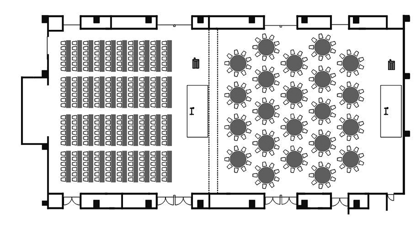 | m² | 坪 | 寸法(m) | 正餐 | ブッフェ | スクール | シアター | ||