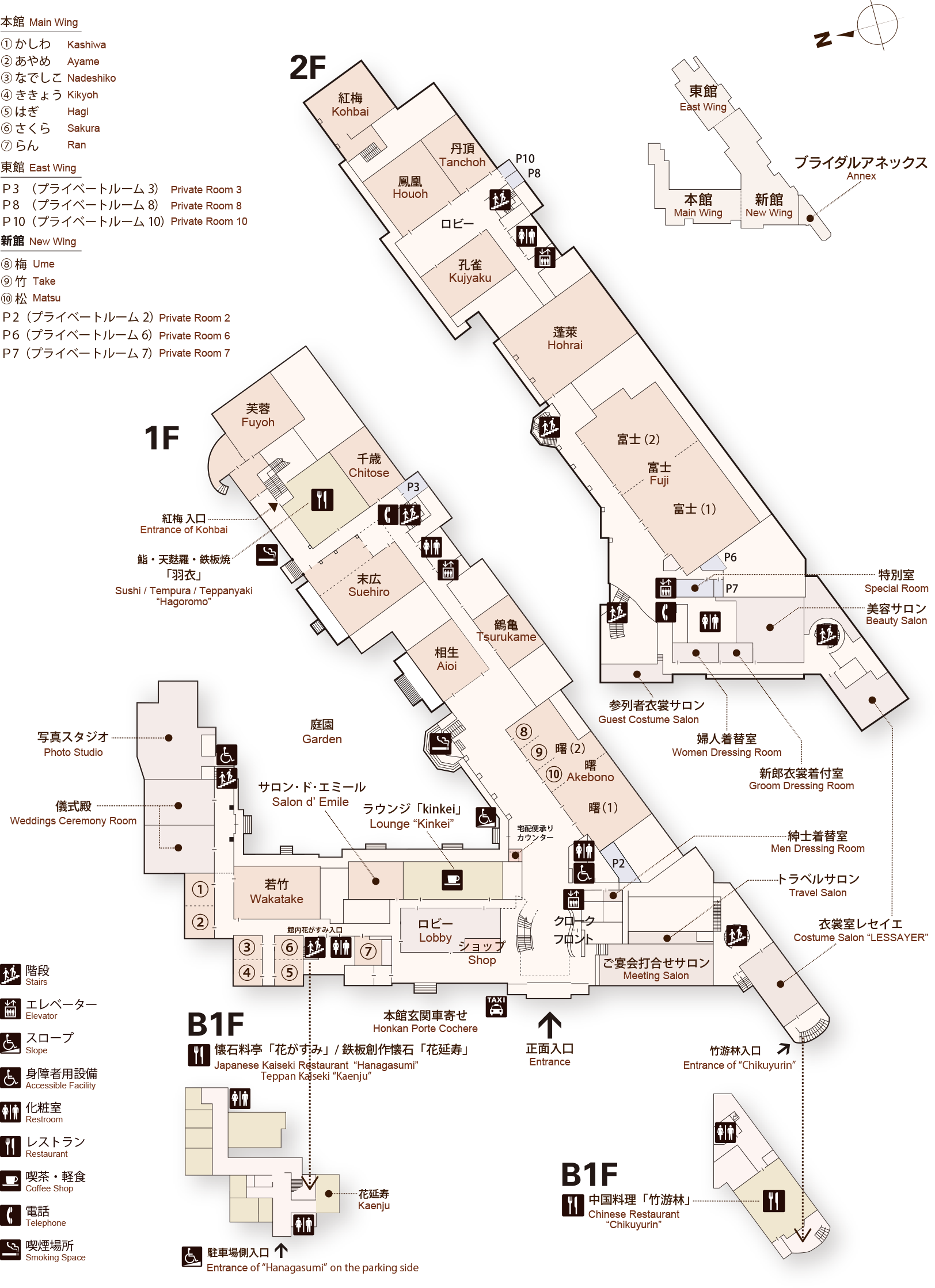 天井高6.6メートルの広々とした空間と、照明・音響などの最高の設備を備えた明治記念館のメインバンケットです。 この富士の間は、世界からおいでになる国賓、ロイヤルファミリー、VIPのレセプションにご利用いただくことも多く、 国内でも指折の格式と華麗な雰囲気には定評をいただいています。 広い空間を使った自由度の高い演出が可能な会場です。