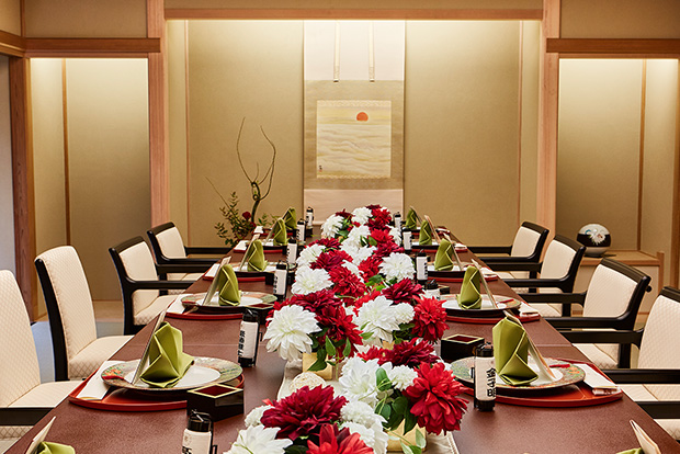懐石料亭「花がすみ」内にある「かいどうの間」は、 外光がたっぷりと差し込む明るいお部屋で、晴れの日を鮮やかに演出致します。 開放感ある一枚の大窓が印象的で、坪庭を彩る四季の移ろいも満喫頂けます。 ゆったりと配置された幅広の専用チェアは、格別なくつろぎを運びます。