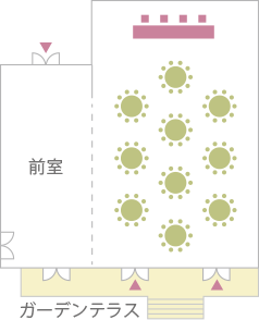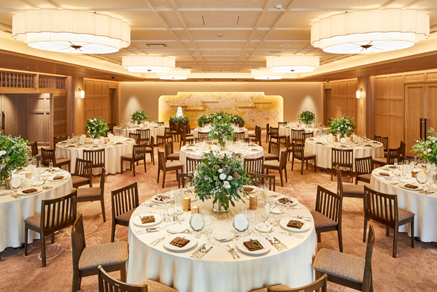 当館に於いて、唯一プライベートホワイエが設けられた会場です。 様々なアレンジができ、お客様のオリジナルウエディングスタイルを演出する事が出来ます。 温かみのある木や和紙で統一された空間は、装花やテーブルコーディネートにより、 表情や印象が多岐に変化する庭園に面したテラス付きの会場です。