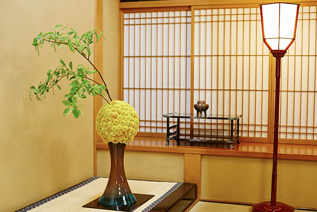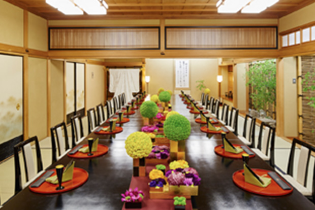 懐石料亭「花がすみ」内にある桃林の間は、 晴れの日にふさわしい品格のある大広間です。 床の間や掛け軸など料亭ならではの趣のあるしつらえの中、特別な一日をお過ごしください。 椅子席ですのでご年配の方やお着物をお召しのお客様にも お楽にお掛けいただけます。